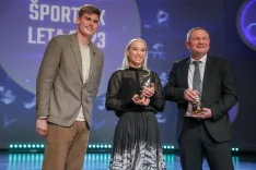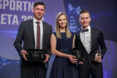 športnik leta 2023 na fotorafiji Anže Lanišek dobitnik priznanja za Fair Play, Nika Križnar in trener Zoran Zupančič vsi dobitniki priznanja olimpijskega komiteja / Foto: Tina Dokl