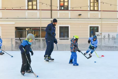 Škofja Loka – Čeprav je bila ura še zgodnja, je bilo minulo soboto na drsališču, ki so ga konec novembra v Škofji Loki postavili na Trgu pod gradom, že zelo živahno. Ledeno ploskev so namreč ogrevali mladi hokejisti kranjskega Triglava, ki so želeli vrstnikom ter tudi najmlajšim Škofjeločanom in okoličanom predstaviti, kako zanimivo je igranje hokeja.