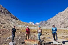 Ženska alpinistična odprava Lalung 2024 v baznem taboru. Z leve: Urša Kešar, Patricija Verdev, Anja Petek in Ana Baumgartner. / Foto: Anja Petek
