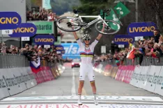 S samostojno vožnjo je po nevarnem spustu nadaljeval vse do Coma in z visoko dvignjenimi rokami v mavričasti majici z belimi hlačkami slavil prepričljivo zmago. Drugi je ciljno črto z zaostankom 3:16 minute prečkal Belgijec Remco Evenepoel (Soudal Quick-Step), tretji pa Italijan Giulio Ciccone, ki je za zmagovalcem zaostal 4:31 minute.