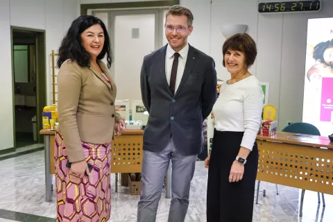Z leve direktorica kranjske porodnišnice Larisa Hajdinjak, predsednik Neonatalne sekcije Gregor Nosan in Andreja Cerkvenik Škafar, zaslužna za organizacijo / Foto: Tina Dokl