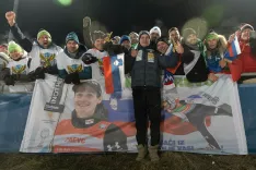Navijači iz Dolenje vasi so dočakali prihod Domna Prevca. Po podelitvah in vseh medijskih obveznostih si je vzel nekaj trenutkov tudi zanje. / Foto: Peter Košenina
