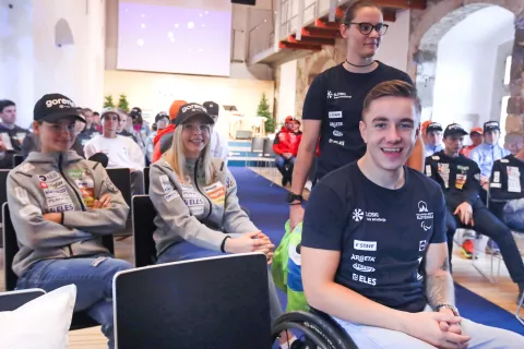 Jernej Slivnik nasmejan na predstavitvi športnikov pred novo zimsko sezono. Za njim sedi njegovo dekle, smučarska skakalka Taja Bodlaj. / Foto: Gorazd Kavčič