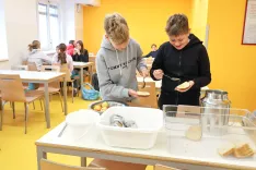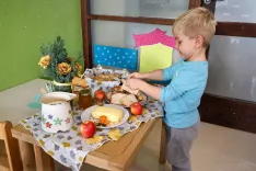 Otroci v vrtcu pri Osnovni šoli Janeza Puharja Kranj – Center so sami spekli kruh in pripravili maslo za zajtrk. / Foto: Tina Dokl