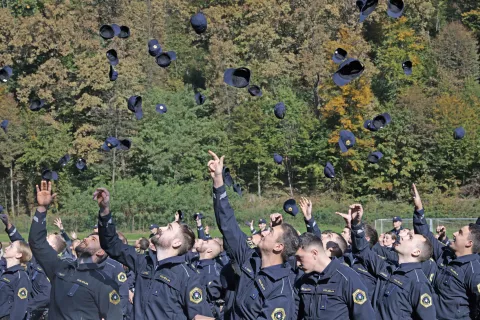 Novopečeni policisti so vrgli v zrak svoje policijske kape in se tako simbolično poslovili od tacenskih klopi. / Foto: Borut Živulović/Bobo