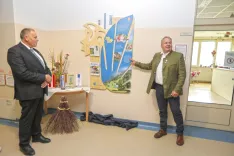 Direktor Biotehniškega centra Naklo Marijan Pogačnik (levo) in Heinrich Mayer iz Biosfernega parka Nockberge ob novi stalni informacijski točki parka / Foto: Tina Dokl