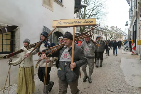 Škofja Loka – Udeleženci srečanja iz Slovenije in tujine so se že zgodaj dopoldne zbrali v Sokolskem domu, od tam pa je nato potekala parada. Veselo druščino v starodobnih oblačilih in s starodobno opremo je spremljal Mestni pihalni orkester Občine Škofja Loka, vsi skupaj so se nato zbrali na Cankarjevem trgu. Tam jih je pozdravil župan Občine Škofja Loka Tine Radinja.