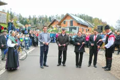 Slavnostni trak so ob simbolnem odprtju nove ceste prerezali župan Rok Roblek, najstarejša vaščana Janez in Joži Vreček ter Metod Jagodic. / Foto: Alenka Brun