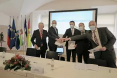 Kamnik – Župani občin Kamnik, Mengeš in Trzin Matej Slapar, Franc Jerič in Peter Ložar, podžupan Mestne občine Ljubljana Aleš Čerin in direktor izvajalca, podjetja KPL, Radenko Ćubić so včeraj v Mekinjskem samostanu podpisali pogodbo za izgradnjo regionalne kolesarske povezave Kamnik– Mengeš–Trzin–Ljubljana in s tem slovesno zaključili štiri leta dolga usklajevanja vseh deležnikov, ki so zdaj pripeljala do skorajšnjega začetka gradnje.
