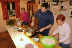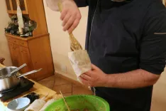 Čebulo drobno sesekljamo in jo na segretem olju v ponvi prepražimo. »Sam vedno mešam belo in rdečo čebulo, zaradi okusa.« Pražimo jo toliko časa, da je zlato rjava. »Sredi praženja solimo. Ko čebula začne rjaveti, dodamo in popražimo majaron, timijan, šetraj, malo popra – po občutku, da začimbe zadišijo.« Dodamo tudi česen, peteršilj, zalijemo z vodo, v kateri se je kuhalo meso, zmešamo in vse skupaj polijemo po kruhu. Dodamo še meso, je pa dobro, da se zmes ohladi, preden ji dodamo jajca. Nato seveda vse dobro pregnetemo.