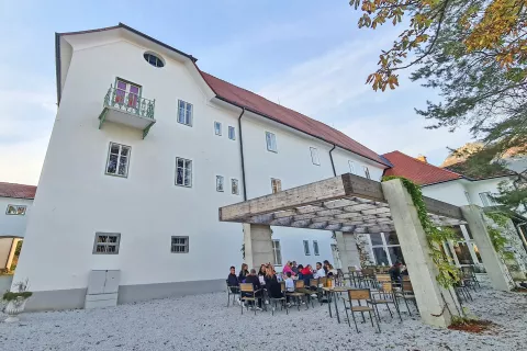 Kavarna v prostorih prizidka gradu Dvor je dobila novega najemnika, na zunanji strani pa pergolo, ki naj bi služila kot podaljšek kavarne. / Foto: Alenka Brun