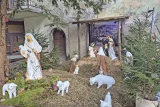 Zakonca Kokelj sta jaslice, ki kraljujejo sredi Poljan, postavila pred hišo nasproti gostilne Na Vidmu. / Foto: Klara Mrak