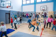 V telovadnici podružnične šole v Begunjah so zamenjali tla ter prostor na novo opremili z mehkimi stenskimi oblogami, letveniki, košarkarskimi konstrukcijami in plezalno steno.