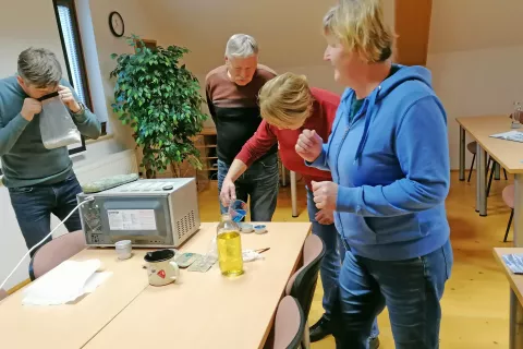 Udeleženci delavnic so se ob koncu preizkusili v izdelavi svečk iz odpadnega jedilnega olja. / Foto: Kristina Miklavčič
