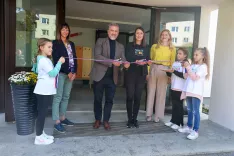 Slavnostni prerez traku; od leve: predstojnica kranjske območne enote Zavoda RS za šolstvo Doris Kužel, župan Peter Miklič, ravnateljica Dina Pintarič in državna sekretarka na šolskem ministrstvu Janja Zupančič z učenci / Foto: Tina Dokl