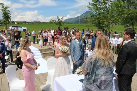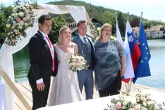 Civilni obred je potekal na jezeru Črnava, za glasbeno podlago je poskrbela zasedba Il Divji, Bašlanski fantje pa so po obredu pripravili še simbolično mini šrango. Lepo vreme, jezero in gorska kulisa so samo še nadgradili doživetje, ki je bilo že tako polno radosti in prijetnih čustev. Cerkvena poroka je bila popoldne v Cerkljah, poročna zabava pa se je nadaljevala v Stražišču, v tamkajšnjem kulturnem domu.