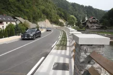 Obvoznica mimo starega dela Železnikov poteka po novozgrajenem obrežnem zidu Selške Sore. / Foto: Gorazd Kavčič