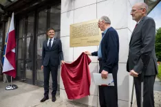 Spominsko ploščo so odkrili kranjski župan Matjaž Rakovec, sodelujoči pri premestitvi orožja Peter Mavser in Jelko Kacin, ki je odredbo podpisal. / Foto: Primož Pičulin
