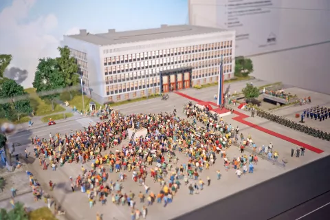 Kdo bi dejal: »Glej, v Ljubljani pred parlamentom spet nekaj protestirajo.« Je to »upokojenski zbor«, ki poje Slakovega Čebelarja? Ali pa gre morda za srečanje jeznih kolesarjev? Podroben pogled na fotografijo nam da vedeti, da ne gre niti za prve, manjkajo zastave in transparenti, niti za druge, saj ni videti koles. Je bil pa tako videti Trg republike v Ljubljani ob razglasitvi samostojnosti Slovenije 26. junija 1991. Ta čudoviti prizor si lahko ogledate na razstavi maket in dioram Slovenija v malem v Šenčurju.