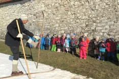 Škofja Loka – Minulo sredo dopoldne je bilo na mini smučišču, ki je že ves mesec pod Škofjeloškim gradom, še posebno živahno. Kar nekaj skupin vrtčevskih otrok je prišlo na ogled starodobnih smučarjev, članov Društva Rovtarji, prav tako pa so mladi na tečaju spoznavali smučarsko opremo in nekateri naredili svoje prve zavoje.
