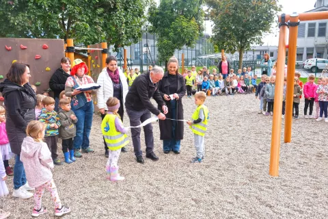Otroci šenčurskega vrtca so nedavno s krajšo prireditvijo uradno odprli nova igrala, trak pa je prerezal šenčurski župan Ciril Kozjek. / Foto: Maša Likosar