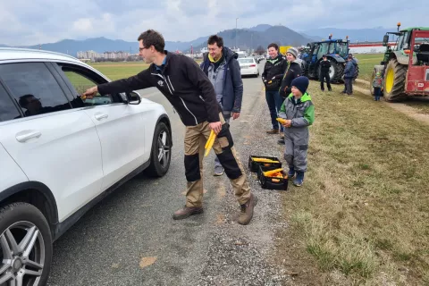 Kranj – Slovenski kmetje nadaljujejo proteste, s katerimi »pritiskajo« na pogajalce in odločevalce. Eden takih shodov je bil v četrtek tudi Kranju, kjer se je približno štirideset kmetov s traktorji in traktorskimi priključki zbralo na poti ob glavni cesti od Kranja proti Šenčurju. Kmetje se tokrat z mehanizacijo niso zapeljali po kranjskih mestnih vpadnicah kot teden prej, pač pa so ob cesti in potlej pred nakupovalnim centrom Supernova Kranj delili voznikom oziroma potrošnikom korenje, ki ga je daroval Grega Drinovec s kmetije na Okroglem. S takšno gesto želijo v prizadevanjih za izboljšanje razmer v kmetijstvu pridobiti tudi naklonjenost javnosti (potrošnikov), ta naklonjenost se kaže tudi v darilu – desetih kilogramih hrenovk, ki so jih protestniki dobili v znak podpore od lokalnega mesarja.