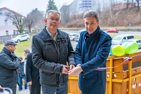 Novo zadružno poslovalnico na Jesenicah sta odprla predsednik zadruge Janez Okorn (levo) in direktor Boštjan Luznar. / Foto: Nik Bertoncelj