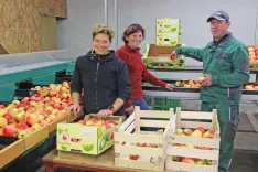 Ob prebiranju sadja (od leve proti desni): tehnologinja Kristina Košelnik, vodja sadovnjaka Tatjana Zupan in sadjar Klemen Logar