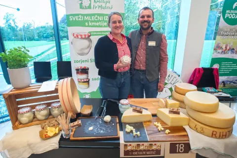 Eva Vrevc in Matevž Jenko s kmetije Pr' Matevž iz Reteč pri Škofji Loki sta svojo sirarsko zgodbo predstavila na posvetu, ponudbo sirov, med katerimi je glavni izdelek mocarela, pa na festivalu na Brdu. / Foto: Gorazd Kavčič