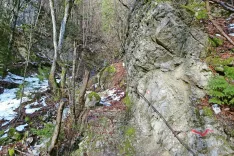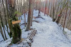 V dolino se vrnemo po krožni poti. Od doma gremo čez travnik proti Kropi in Kamni Gorici. Pot se lepo spušča skozi gozd. Ta del poti je močno snežen in tudi steza se predira oz. je naluknjana. Ko pridemo do razpotja, kjer levo zavije steza v Kamno Gorico, gremo mi desno proti Kropi. Pot lepo v okljukih vijuga čez strmo pobočje. Malce naprej od enega okljuka nas iz skale gleda pravi peklenšček.