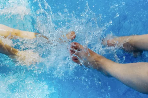 Pogosta rehabilitacija ob poškodbah je vadba v bazenu. Topla voda omehča sklepe, voda nam odvzame težo, vse vaje in gibanje gredo lažje. Če hodimo po kopnem z berglami, v bazenu lahko hodimo brez njih. Če na kopnem koleno ali kakšen drug sklep komaj upognemo, gre po nekajurnem namakanju v bazenu upogibanje, kot bi sklepe namazali z oljem. Res je, da so toplice najprimernejše za terapije po poškodbah, ker pa imam v Kranju olimpijski bazen praktično pred nosom, hodim sedaj tudi v kranjski bazen. V malem bazenu je voda ogreta na 29 stopinj Celzija. Ni najbolj toplo, vendar dovolj, da lahko delam vaje. V bazen hodiva s prijateljico, ki je prav tako poškodovana. V družbi je vedno lažje in spodbuda je dobrodošla. Bazen za zunanje obiskovalce se odpre ob 7. uri zjutraj. Pričakovala sem, da bodo takoj zjutraj tam profesionalni plavalci, ki so na treningu, vaterpolisti in drugi. Prav zares pa sem bila presenečena, da je navsezgodaj zjutraj tam veliko upokojencev. Prav ste slišali, upokojencev, ki opravijo svojo telovadbo. Ko sva midve nekaj minut do osme ure vstopili v bazen, ga je ena ekipa upokojencev že zapuščala. Gospod jih je imel več kot osemdeset. Dejal je, da pride na plavanje enkrat tedensko. Celo življenje mu je šport pomenil veliko. Ko je preživel kap, mu je telo zelo opešalo. Ni si predstavljal, da bo še kdaj plaval, pa volja in trma naredita veliko. Danes zopet plava in je zelo vesel in ponosen, da to zmore. Ko vidiš takšne ljudi, dobiš tudi sam še več poguma in zdi se, da je lastna težava pravzaprav težavica. Ob deveti uri so prišli otroci iz vrtca. Malčki palčki, ki pravzaprav niso malčki, to so bili najstarejši vrtčevski otroci, stari pet let. V sklenjeni koloni so prišli v prostor. Vsi so imeli plavalne kape, fantje modre, deklice rožnate barve. Okrog vratu so imeli brisačo, ki so jo spodvili pod pazduhama. Otrok zadaj se je prijel koncev brisače in tako so ustvarili sklenjeno kolono, kačo. Če sem starejšega gospoda občudovala, sem se ob pogledu na malčke raznežila. Prevzeli so jih učitelji plavanja, ki so pod budnim očesom spremljali in usmerjali njihov napredek. Najbolj so bili veseli na koncu, ko so se lahko igrali.