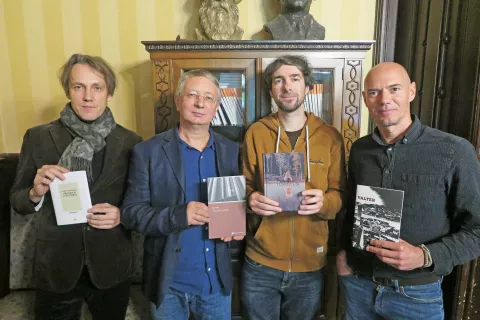 Nominirani avtorji pesniških zbirk za Jenkovo nagrado: (od leve) Robert Simonišek, Ivan Dobnik, Denis Škofič in Borja Bolčina (manjkata Miljana Cunta in Aleš Berger). / Foto: Igor Kavčič