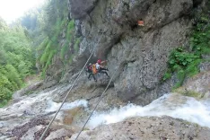 S parkirišča se povzpnemo po stopnicah skozi vrata 'Druiden Land' in nadaljujemo naravnost, precej strmo skozi gozd. Pot nas pripelje do kolovozne poti, ki poteka vzporedno s travnikom. Nadaljujemo naravnost in po približno 15 minutah smo na razpotju; smerokaz 'zum Rotschitza Wasserfall Erlebnisklettersteig B/C' nas usmeri levo, prečno v smrekov gozd. Zaslišimo šumenje vode in malenkostno izgubimo nadmorsko višino. Ko pridemo do potoka, nadaljujemo do klopce, kjer se opremimo z vso potrebno opremo: plezalni pas, samovarovalni komplet in čelada. Priporočam tudi plezalne rokavice. Pred vstopom v ferato prečimo potok. Vstopni metri so olajšani s klini, ob katerih tudi ves čas poteka jeklenica. Začetni del poteka po skali na levi strani potoka; po prvem delu nas jeklenica vodi pod rahlo previsno skalo, kjer sledi tehnično najzahtevnejši del, ocenjen z B/C; prišli smo do dveh jeklenic. Na zgornjo se pripnemo, po spodnji bomo hodili. Vmes se bomo obrnili za 180 stopinj in gledali v dolino ter prečili potok. Ja, malce adrenalina pa je. Ko smo čez potok, nadaljujemo ob njem navzgor in ga ponovno prečimo. Spet smo na levi strani potoka, sledi še eno prečenje, kjer smo v primeru zadostne količine vode tudi 'stuširani'. Potoku sledimo navzgor in ferate je hitro konec. Predlagam, da se na vrhu slapu sprehodimo čez potok in nadaljujemo po stezi, ki kaže proti gostišču Baumgartnerhof, saj bomo dosegli markirano stezo, ki pelje levo proti Maloškemu Poldnevu. Lahko pa nadaljujemo še naprej ob potoku, celo nekaj rdečih puščic je, nato pa se po strmi lovski težko sledljivi stezi povzpnemo čez desni breg do markirane poti, ki jo dosežemo ravno pri znamenju.
