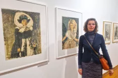 Kustosinja razstave Andreja Borin ob monotipijah Lužičank v narodnih nošah / Foto: Igor Kavčič