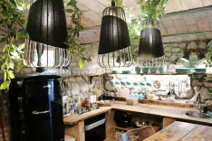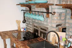 Čim več stvari iz stare hiše je par poskušal obdržati. Moderne linije se tako prepletajo z duhom starega, v prostorih prevladuje močan leseni element, masiva, nekaj kosov je še prav posebno zanimivih. Tako v kuhinjo na primer najdemo prefinjeno vpet stari masivni mizarski »ponk«, postelje sestavljajo različni stebri kozolca. Določeni kosi lesa so na ta način v bistvu dobili novo priložnost. Iskala sta jih lokalno, raziskovala trge, namenjene tovrstni ponudbi. Še stari sod pod koritom v sobi za druženje je dobil novo funkcijo.