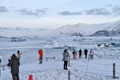 Ledeniški jeziki segajo globoko v ravnino. Marsikje se na kilometer približajo leta 1974 zgrajeni 1500 kilometrov dolgi glavni cesti, ki pelje okoli otoka. Eden od ledeniških krakov največjega islandskega ledenika Vatnajokull, ki pokriva 8300 kvadratnih kilometrov in katerega del je tudi najvišja 2119 metrov visoka islandska gora Hvannadalshnúkur, pa sega do Atlantika. To je znamenita ledeniška laguna Jökulsárlón, v kateri se ledeniška gmota lomi v ledene gore, ki plavajo proti Atlantiku in se zaradi mešanja sladke in slane vode na črni peščeni plaži spreminjajo v lesketajoče diamante! Zato ime Diamantna plaža. Poleti, ko laguna ni zamrznjena, obiskovalce s posebnimi ladjicami vozijo med ledenimi gorami. Če imaš srečo, imaš na ledeni ploskvi skoraj na dosegu roke počivajočega tjulnja, posebnost lagune. Nedaleč stran se nad črno plažo in morjem dvigajo do sto metrov visoke bazaltne stene, ki jim je igra narave dala podobo orgelskih piščali. Zaradi tega imajo preprosto ime Orgle. V vetrovnem vremenu pa obisk lagune in obale spremlja še grozeče bučanje metrskih valov razburkanega Atlantika.