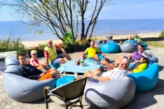 Naslednjih deset kilometrov smo vztrajno kolesarili po glavni cesti, nato pa zavili na stransko pot, ki nas je vodila proti morju, skozi slikovito ribiško mestece Zvejniekciems ob izlivu reke Age v Baltsko morje. V kraju Saulkrasti, znanem po znameniti Beli sipini, nas je pričakala prijetna obmorska oaza – lokal tik ob plaži, kjer smo si privoščili krajši oddih in zasluženo okrepčilo.