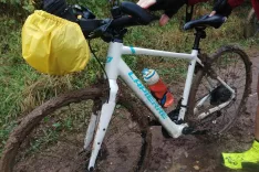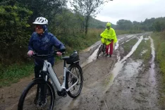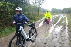 Ko smo že mislili, da je vsega hudega za tisti dan konec, se je najhujše šele začelo. Čakal nas je še dvokilometrski spust do vasi Bučje. Na poti tokrat ni bilo samo blato, ampak ilovica, ki se je lepila na gume. Še posebno velike kepe so se nabirale v vilicah, kar je povzročilo, da se kolesa niso obračala, tudi če smo jih potiskali peš. Velike kepe je bilo treba vsakih nekaj metrov odstraniti. Ko je bilo ilovice konec, smo kolesa toliko očistili, da smo se lahko spustili do vasi Bučje. Ko sva s Tonetom v vasi prala kolesi in gospe, ki nama je prijazno ponudila cev in vodo za pranje, razlagala, kako smo kolesa tik nad vasjo rinili po ilovici, jo je zanimalo, kaj smo iskali tam gor. Ko sva omenila EuroVelo 13, pa je le zamahnila z roko.