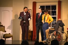 Vse se dogaja z bliskovito naglico, v sobi se pojavljajo od direktorice hotela, natakarja in sobarice do ministrove žene, skrbnice tajnikove mame in ne nazadnje »trupla«, ki si eden za drugim podajajo kljuko vrat in okna. Režiserka nas spretno vodi skozi predstavo, ob kateri niti za trenutek ni dolgčas, saj moramo gledalci vseskozi slediti dogajanju, sicer se lahko izgubimo v prepletu zmešnjav. Velja dodati, da je režiserka imela tudi srečno roko pri izbiri igralk in igralcev za posamezne vloge. Ti se odlično vživljajo v svoje like, poleg odličnih Timoteja Kresnika in Reneja Borštnarja nas navduši tudi preostala osmerica: natakar Marko Kern, Tjaša Predan v vlogi ljubimke Jane Mrhington in Admir Babič kot njen prevarani mož Ronnie Mrhington, Luka Pogačnik je v gibu odlično truplo, prav tako pa celotno sliko odrske ekipe dopolnjujejo Kaja Petek kot Gladys Foster, Mojka Žagar kot direktorica, Nastja Verdinek kot Pamela Pimpy in Katarina Zupan kot sobarica. Za kostume, rekvizite in odrsko poslikavo je poskrbela Eva Serpan Sitar, asistentka režije pa je Maja Mihevc.