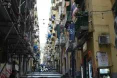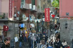 Nadaljevala sva mimo Piazze de Plebiscito, naprej proti morju, kjer se nama je iz vrtov Molosiglio odprl čudovit pogled na 1280 metrov visok Vezuv. V času kosila sva pristala na ulici Tribunali, v starem mestnem jedru, kjer je vladal popoln kaos. Dolge kolone lačnih turistov so se vile iz picerij in kioskov z ulično hrano ter se umikale picopekom, ki so se s srebrnimi pladnji, polnimi svežih hlebčkov testa, poskušali prebiti do svojih peči. Rahlo opita mladina na ulici je nazdravljala z ravno namešanimi hladnimi aperoli, vse skupaj so pa z glasnim hupanjem spremljali mopedisti, ki so spretno vijugali med pisano množico.