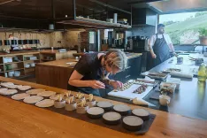 Pred Gričem nas je pričakal Nejc Farčnik, ki skrbi za vse drugo, da se lahko kuharski mojster Luka Košir povsem posveti kuhanju ter uresničevanju svojih kulinaričnih vizij in razmislekov o okusih. Farčnik nam je povedal marsikaj o restavraciji, družinski zgodbi, ki stoji za Gričem, in tudi o vrtu za šparglje, za cvetlice, o tem, kako so 90-odstotno samooskrbni, kar se tiče zelenjave ... O vloženinah, da je fermentacija neke vrste hišni hobi, da brez domačih misov (v osnovi znana japonska začimba) pri njih ne gre. Pa o kmetiji »čez cesto«, na vidnem sosednjem griču, kjer gojijo koze, in o zlatovčici, ki jo ravno tako dobijo v bližini. Z roko je nakazal smer, na drugo stran hriba, kjer imajo mesarja. Izvedeli smo, da so si v kleti uredili zorilnico za meso, ki smo si jo kasneje tudi ogledali, farmo rac imajo v smeri proti Žirem ... in še in še.