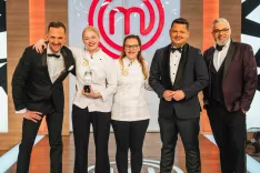 Sodnik Mojmir Šiftar, zmagovalka letošnjega MasterChefa Miša Koplova, drugouvrščena Barbara Poljanec ter sodnika Luka Jezeršek in Karim Merdjadi / Foto: arhiv oddaje (LiparDesign Photography)
