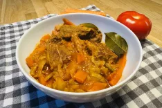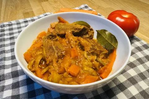 Meso narežemo na manjše medaljone ter ga popopramo in posolimo. Čebulo olupimo in nasekljamo, korenje in zelje narežemo na trakove. Ponev segrejemo, prilijemo olje ter na njem popečemo meso. Dodamo nasekljano čebulo in pražimo 5 minut. Nato dodamo še narezano zelje in korenje. Potresemo z vsemi začimbami, dosolimo ter zalijemo s paradižnikovo mezgo. Dobro premešamo in pokrijemo posodo. Na srednji temperaturi dušimo približno 45 minut oziroma toliko, da se meso zmehča. Po potrebi dolijemo še nekaj tekočine. Na koncu po okusu dodatno še začinimo. Postrežemo k izbrani prilogi, kot so testenine, polenta, pire krompir.