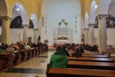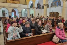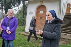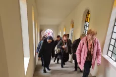 Najprej smo se po ozki poti zapeljali do Mirenskega gradu, ki stoji na griču nad Mirnom. Ob poti so nas spremljale kapelice križevega pota, ki so jih zgradili leta 1931 po načrtih arhitekta Ivana Vurnika, rojenega v Radovljici. Mirenski grad je duhovno središče v bližini Nove Gorice, v preteklosti znano in množično obiskano romarsko središče, kjer danes delujejo lazaristi z duhovnikom dr. Petrom Žakljem na čelu, sestre usmiljenke in Društvo prostovoljcev Vincencijeve zveze dobrote. Ob vhodu nas je pozdravila tudi sestra Ancila, ki se je pridružila vodnici. Povedala nam je na primer, da je na bližnjem pokopališču pokopanih 183 sester usmiljenk, kar govori o tem, kako velik je bil nekoč ta samostan. Danes so v njem še štiri sestre. Sestra Ancila nas je nato popeljala po svetih stopnicah, na vrhu katerih je božji grob s fresko, ki jo je naslikal Tone Kralj. Ta pogumni rodoljub in krščanski humanist se je v času italijanske fašistične okupacije Primorske izpostavil zlasti skozi umetnost tudi kot protifašist in na veliko svojih slikah in cerkvenih freskah upodabljal fašiste kot zveri, Mussolinija pa kot hudiča oz. kot Kristusove krvnike. S podobno tematiko je opremil tudi slike v mirenski cerkvi Žalostne Matere Božje. Oko obiskovalca cerkve pritegne Kraljev kip Žalostne Matere Božje, ki v naročju drži Dete – kombinacija klasične in moderne kiparske tehnike. Za plačilo za svoje poslikave je Tone Kralj prosil zgolj za hrano in nekaj malega za materialne stroške. Skupaj smo v cerkvi zapeli še dve pesmi in se zatem sprehodili po okolici cerkve. Spoznali smo, kakšno je delo varovancev in uslužbencev na Mirenskem gradu ter katera dela opravljajo sami. Skupnost, ki tam biva, je v veliki meri samooskrbna – ukvarjajo se z vrtnarjenjem, gojijo nekaj prašičev. Zelenjavo, ki jo na vrtu pridelajo sami, tudi večinoma sami porabijo, viške pa konzervirajo ali prodajo.