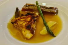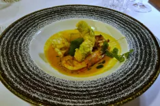 Tako kot sta bila Ferjančičeva pinela in zelen, oba letnik 2023, odlična izbira k postreženim grižljajem in hrani, nas je navdušil tudi Dularjev laški rizling (2021), sploh pa chardonnay (2020). Verjetno so vina prišla še toliko bolj do izraza zato, ker so bila res odlično »poročena« s postreženimi jedmi oziroma pozdravi iz kuhinje. Poširana ostriga z espumo kokosa, lososov rilet, dimljen losos, kaviar lososa in opečen kruhek, pa vongole, kaneštrele, dagnje, osočnik, majoneza peteršilja in marmelada pancete so bili pozdravi, ki jim je sledila topla predjed: ovratnik brancina, tunina, juha dashi (iz alg), beluši, pire čebule in furikake. Azijski pridih pa je potem nadgradil afriški braai v glavni jedi: jadranski ligenj, začinjen z afriško začimbo braai, tempura velike kozice ter pikantna ribja juha.