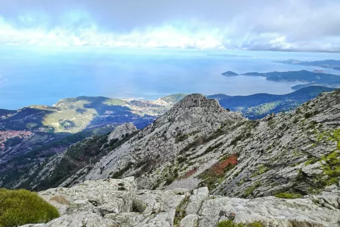 Razgled z vrha, ko pogledamo proti severu in se nam pokaže razlenjena obala in znano turistično mestece Marciana Marina. / Foto: Jelena Justin