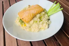 Za pripravo porove rižote z lososom potrebujemo: 400 g srednje zrnatega riža, 1 večji por, 1 čebulo, 2 stroka česna, 1 manjše korenje, 1,5 dl belega vina, približno 1 liter jušne osnove, dva ščepca kurkume ali karija, ščepec popra, 4 manjše fileje lososa, olivno olje.