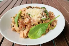 Za pripravo paradižnikovih testenin s špinačo in bučkami potrebujemo: 500 g testenin, 500 g paradižnikovih pelatov, 1 manjšo bučko, 1 čebulo, 2 pesti sveže špinače, 1 žličko suhe bazilike (ali še boljše šopek sveže bazilike), sol, 1 žlica olivnega olja.