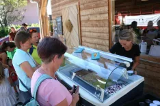Kogar je zanimala preteklost, kmečko orodje, predmeti iz starih časov je lahko o tem povprašal restavratorja Roka Valjavca, ki sicer prihaja iz sosednjega kraja, Britofa. Obiskovalci so lahko v živo spremljali, kako poteka brušenje nožev, za ostrino skrhanih rezil je bil zadolžen Miha Jezeršek iz Žlebov. Marko Dolenc je razveseljeval z mesnimi okusi, prepoznavno kranjsko klobaso z domače, Hribarjeve mesarije, prisoten je bil tudi Štefan Čebašek iz Verja pri Medvodah z ekološke kmetije Pr' Črnet. Iz Žirovskega Vrha s kmetije Budl se je s svojimi znamenitimi kislimi kumaricami in jagodno marmelado ter sokovi in sirupi oglasila Vesna Kavčič. Obiskovalce je zanimala tudi ponudba ekološke kmetije Šlibar iz Kovorja, sploh njihovo pivo. Klemen Klavčič (blagovna znamka Naše) iz Cegelnice pa je predstavil pesto omake, likerje in sokove. Mimogrede smo izvedeli, da smo pesto na stojnici lahko okušali iz malih keramičnih posodic, ki so delo njegove soproge. Potem so bili tu še trije nadobudni fantje – Nace, Štefan in Janez –, ki so pekli palačinke z različnimi nadevi. Lahko ste si privoščili tudi »šmorn« in okušali sladoled iz senenega mleka s kmetije Odéms.