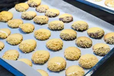 Najprej zmešamo vse suhe sestavine, ki jim nato dodamo še na lističe narezano maslo, rumenjaka in limonin sok. Vse skupaj zgnetemo v testo. Testo oblikujemo v dva debelejša svaljka premera 3 cm, zavijemo v folijo in postavimo v hladilnik za eno uro. Ohlajeno testo narežemo na pol centimetra debela kolesa. Polagamo na pekač, prekrit s peki papirjem. Pečemo na 180 °C 15 minut.